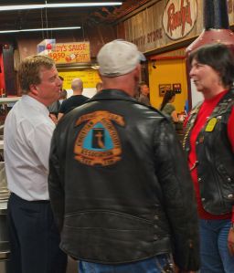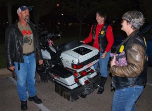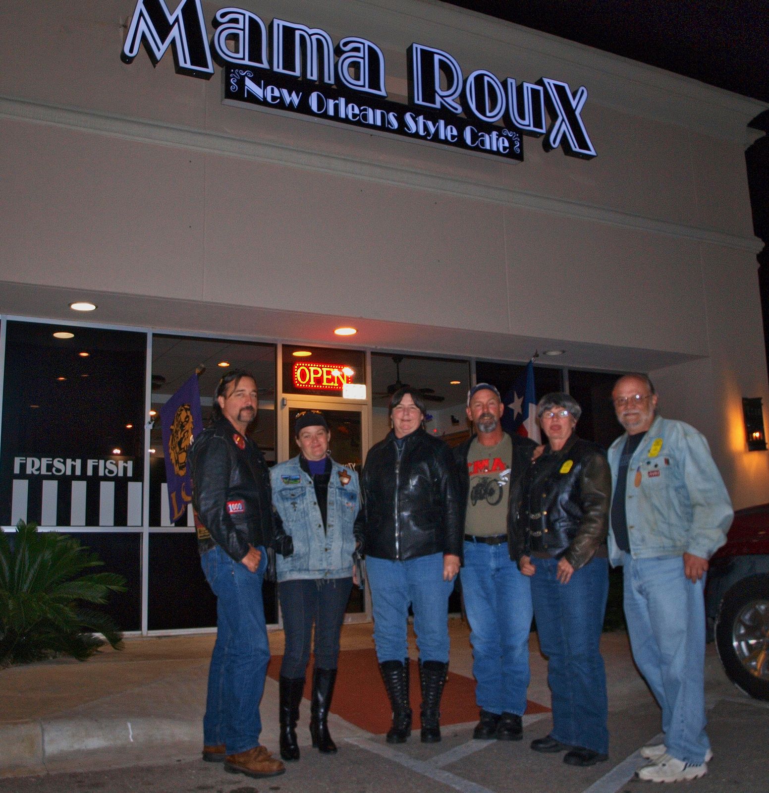 We met at Rudy’s for our monthly (second Thursday) chapter ride for a desert run to Mama Roux. While at Rudy’s, we saw Mark Murray the KVUE channel 24 Weatherman, who Susan apparently knows, so she went up and talked with him while he was in line trying to get some BBQ. About 7PM, we left to ride to Mama Roux. Louis who planned the ride, but couldn’t meet us at Rudy’s, so he had told us that we were going to Mimi’s over where the Walmart is, near Parmer and IH35. We rode over there and couldn’t find a Mimi’s, so we were parked near Mama Roux and gave Louis a call. He fessed up that it was really mama Roux we were going to, so we just waited for him to arrive. The purported specialty of Mama Roux is the Strawberry /Raspberry – Tabasco Cheesecake, and I must say it is wonderful, with just a little bit of bite to it. Sorry, I didn’t get a picture of the cheesecake, but when it arrived, I was too excited to take any pictures.