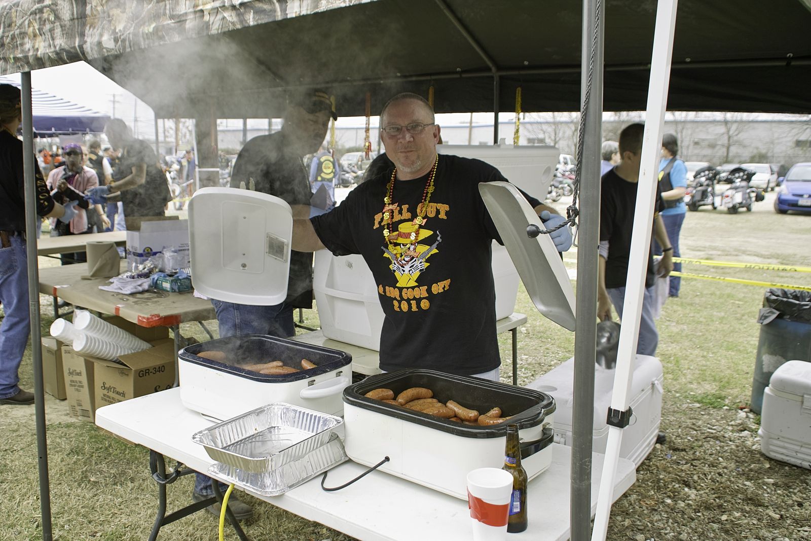 We went to the Escondidos MC 2nd annual Mardi Gras Party, which was a crawfish boil at C-Hunts in Austin on Burnet Rd. Had a big group there, and the weather started out kind of rainy in the morning, but cleared up about the time the party started at 1PM. We planned to meet at the Starbucks up in Round Rock near the Outlet Mall, but though Debbie and I were there, no one else showed up. Turns out there are two Starbucks with apparently the same address but a block apart. Anyway we finally connected up with the Potters, and headed down to the party. Janice met us at C-Hunts, then we headed in to talk and greet all our friends. As you can see, I took a few pictures. Debbie and I aren’t big crawfish fans, so we opted for the tubular crawfish that tasted just like sausage. Boy was it good. After eating, we listened to some great music from a group laying some cajun music. They were really good, and matched the party mood perfectly. Finally we bid the party goodbye, and headed off into the sunset, or maybe that was afternoon set. Anyway, it was a great time. If you weren’t there, you sure missed it.