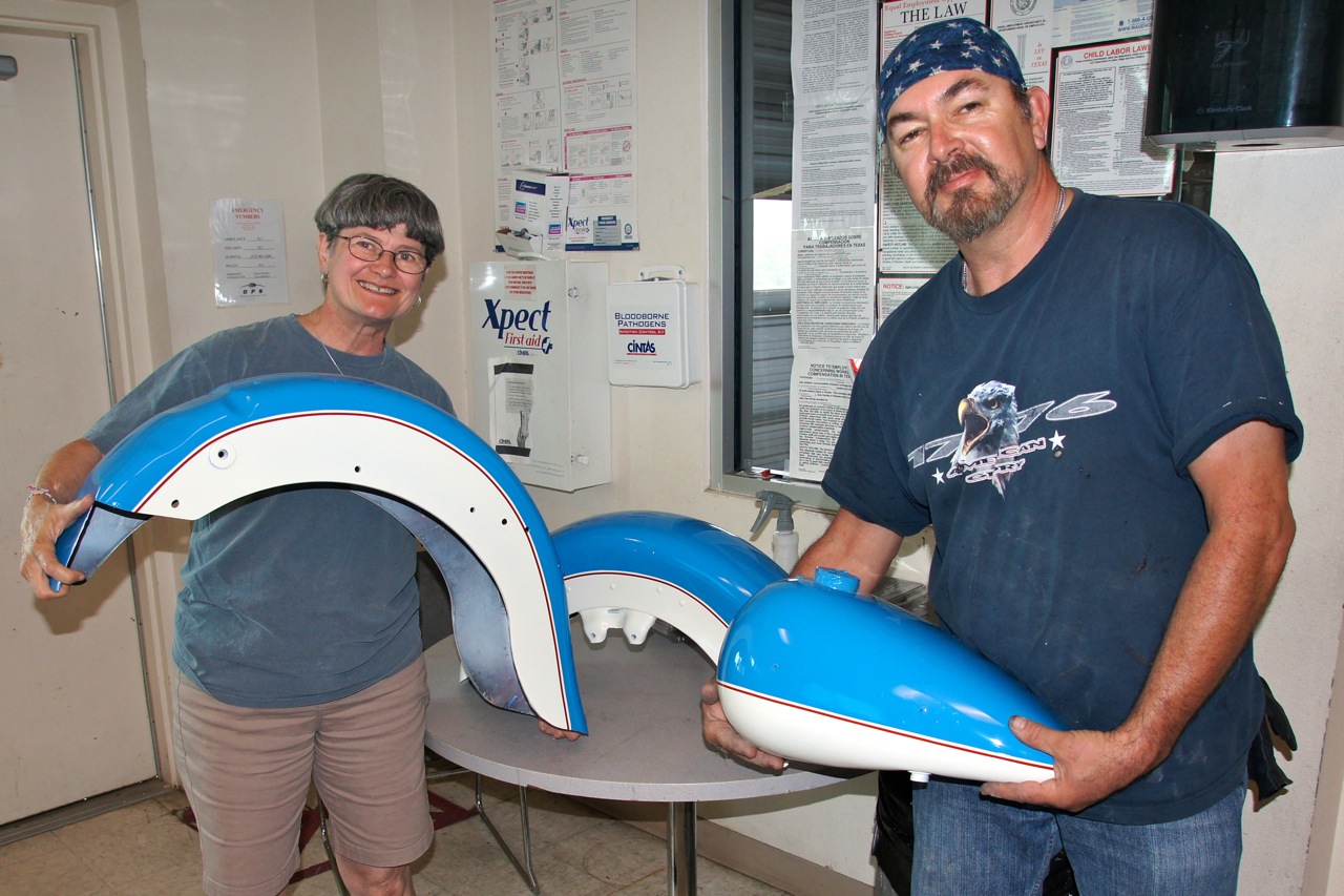 Our friend Marty called to let us know that the tins for Miracle (Debbie’s ’73 Shovelhead) were done, so we hurried up to his shop to pick them up. Can you spell EXCITED!