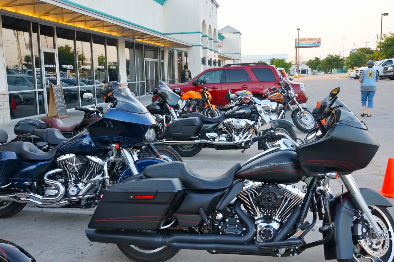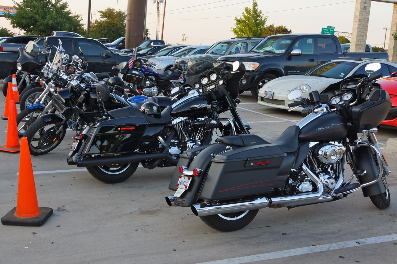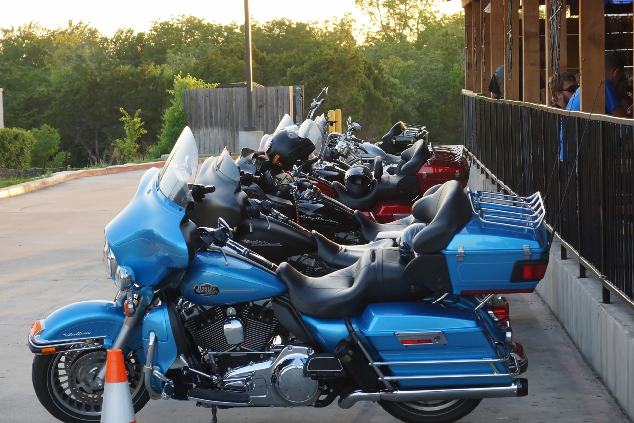 Debbie and I went to Bike Night at Spinners for dinner this evening. We arrived around 6:45, I guess it was a bit early, seeing as we were just about the first ones there, but the stewardess, I mean waitress was friendly and attentive. We diverted from our usual fare (the Blue Cheese Burger) and ordered the Spinners Specialty Chipotle Burger. Very tasty! The music was also good, and made for a relaxing biker kind of atmosphere. As we were enjoying our food, lots of other people arrived to fill the place up. As you can see from the photos, all the marked off bike parking area was consumed. The first two photos are of course of my beautiful wife as she donned her Colors. Ignore the red car behind her.