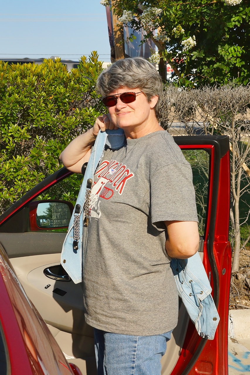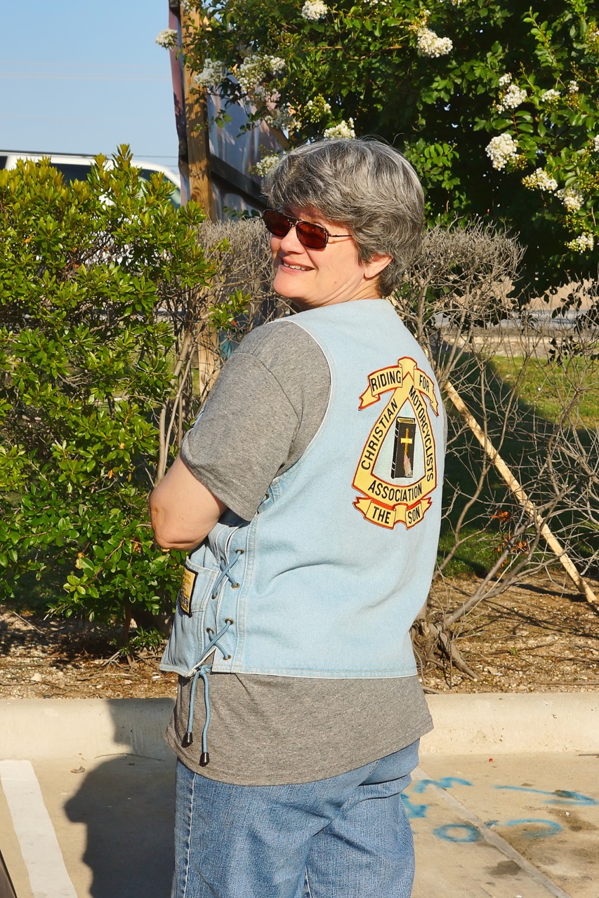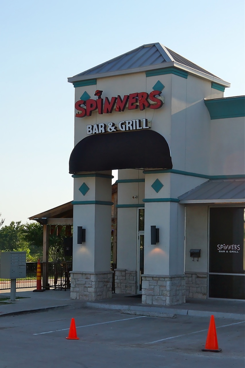 Debbie and I went to Bike Night at Spinners for dinner this evening. We arrived around 6:45, I guess it was a bit early, seeing as we were just about the first ones there, but the stewardess, I mean waitress was friendly and attentive. We diverted from our usual fare (the Blue Cheese Burger) and ordered the Spinners Specialty Chipotle Burger. Very tasty! The music was also good, and made for a relaxing biker kind of atmosphere. As we were enjoying our food, lots of other people arrived to fill the place up. As you can see from the photos, all the marked off bike parking area was consumed. The first two photos are of course of my beautiful wife as she donned her Colors. Ignore the red car behind her.