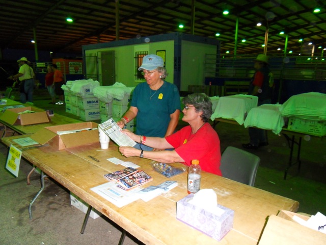 And finally, a picture of Debbie with a friend, working at the end of the day. While she was working the pre-registration table, putting on armband, I worked up on the computers checking in rally tickets.