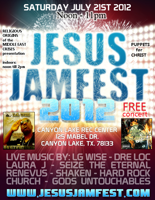 While I was at the UCOA meeting this evening, someone gave me information about the Jesus Jam Fest that is happening in Canyon Lake, TX this weekend on Saturday July 21st. Sounds like a great pace to be for a free concert.