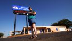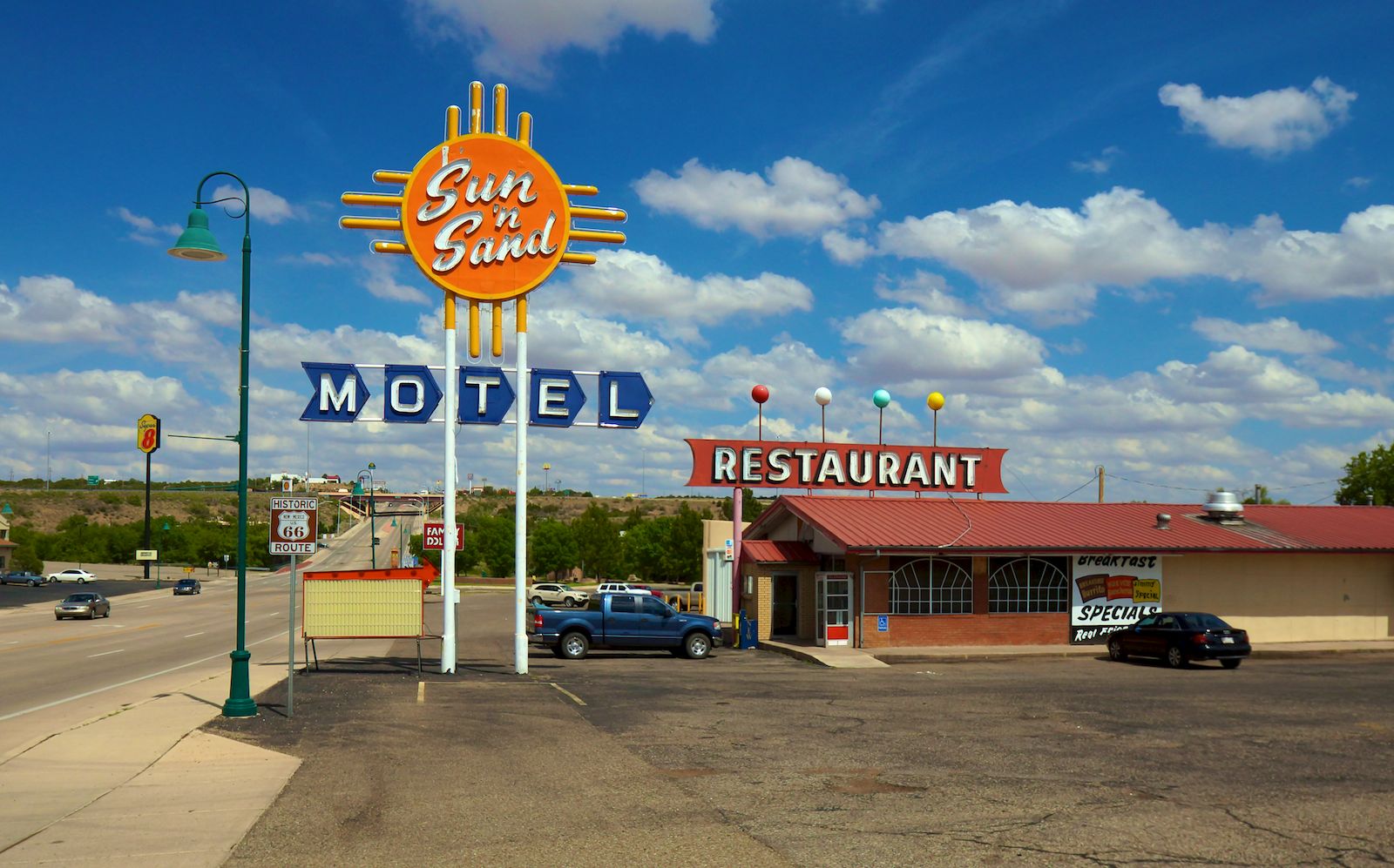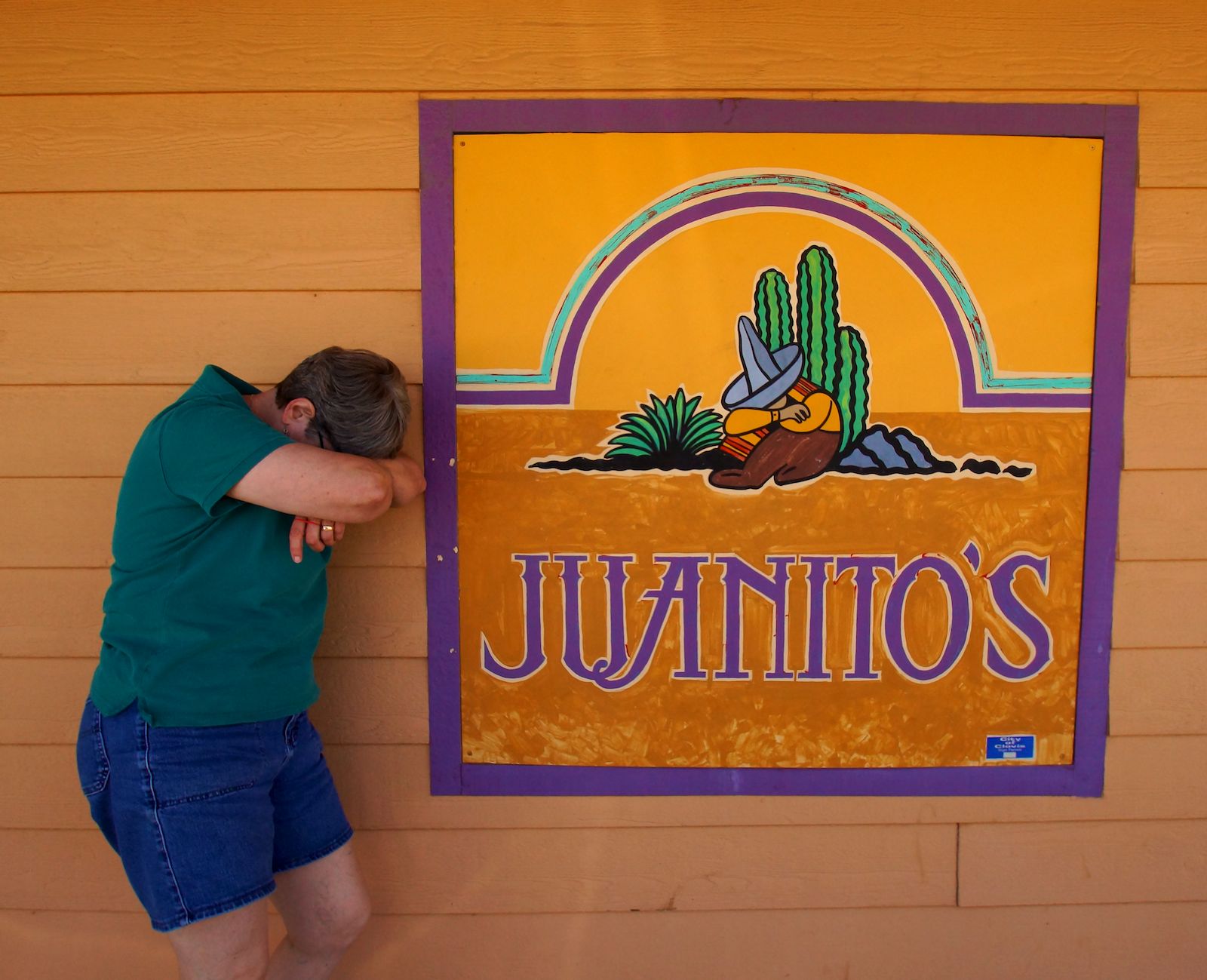 Debbie is taller than the hotel we stayed at. A train out the window of the car. Crossing into New Mexico. Lunch at Juanitos where Debbie tried to take a nap like the person on the sign. And finally two historic locations on route 66.
