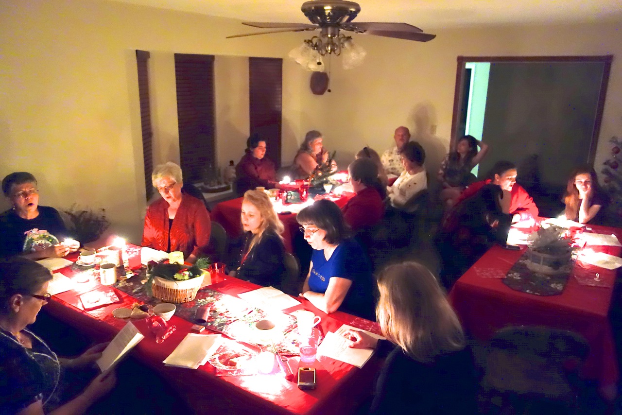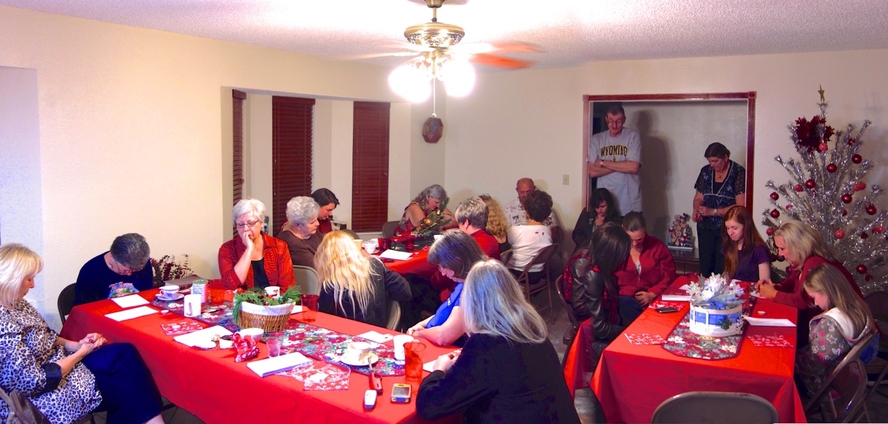 A bunch of the ladies got together last evening for their annual Victorian Tea. Tea was sipped and songs were sung and fellowship was enjoyed. Ignore Jerry in the background, he was just visiting after our men’s activity at Rudy’s.