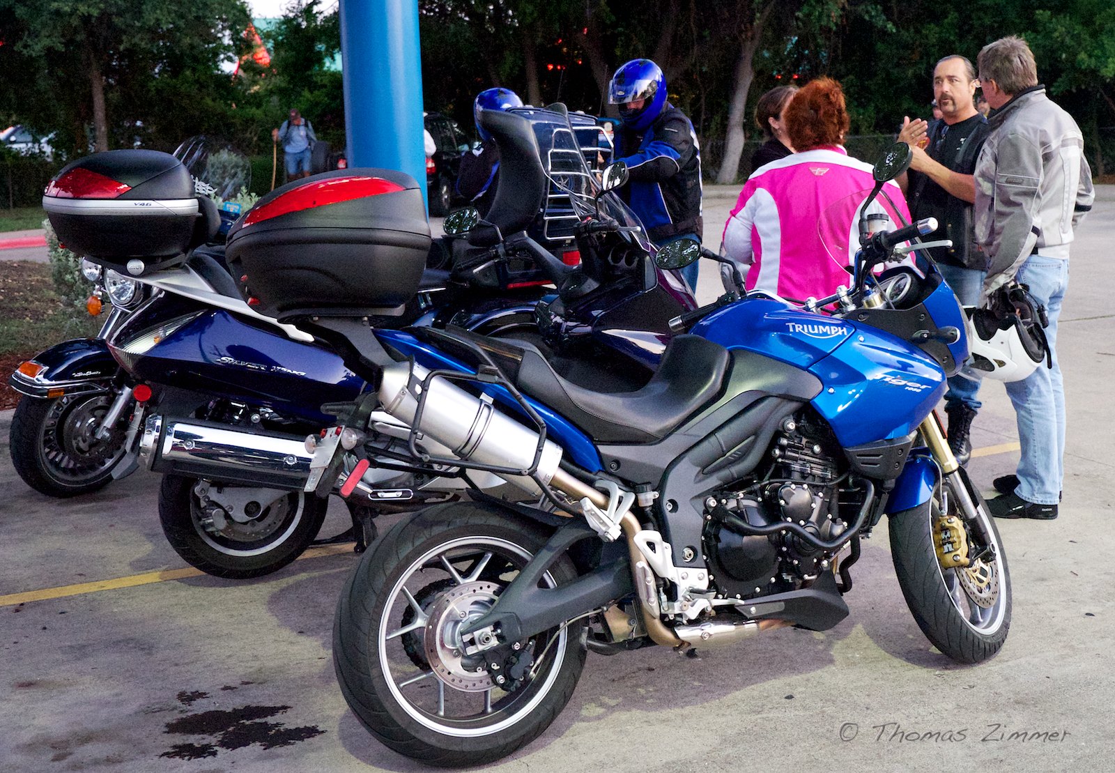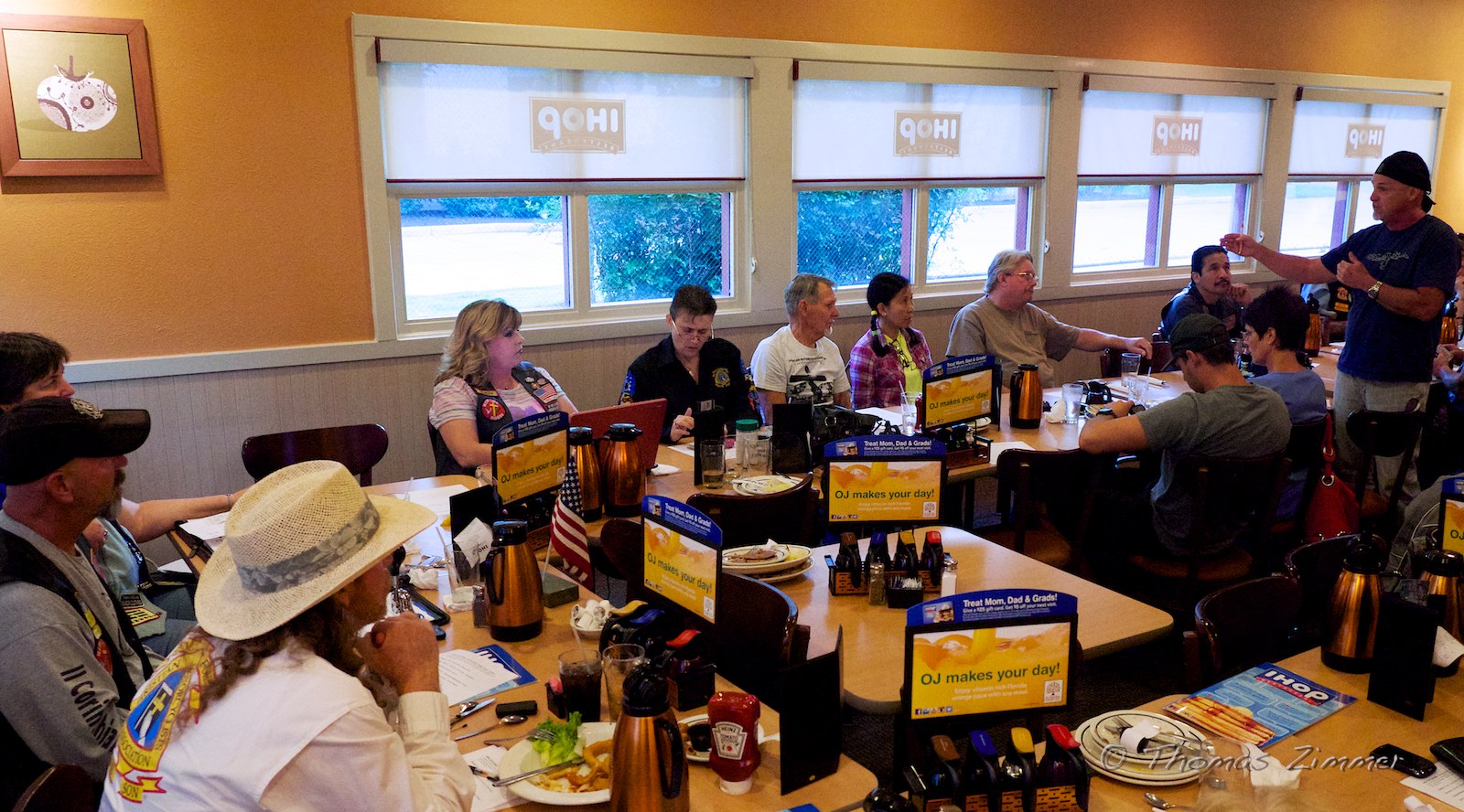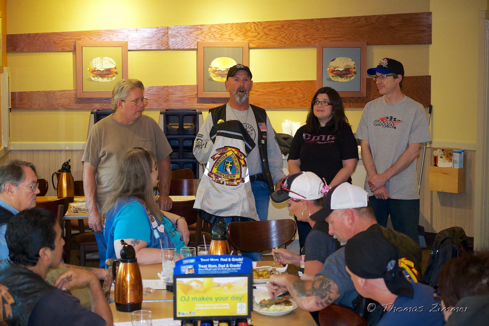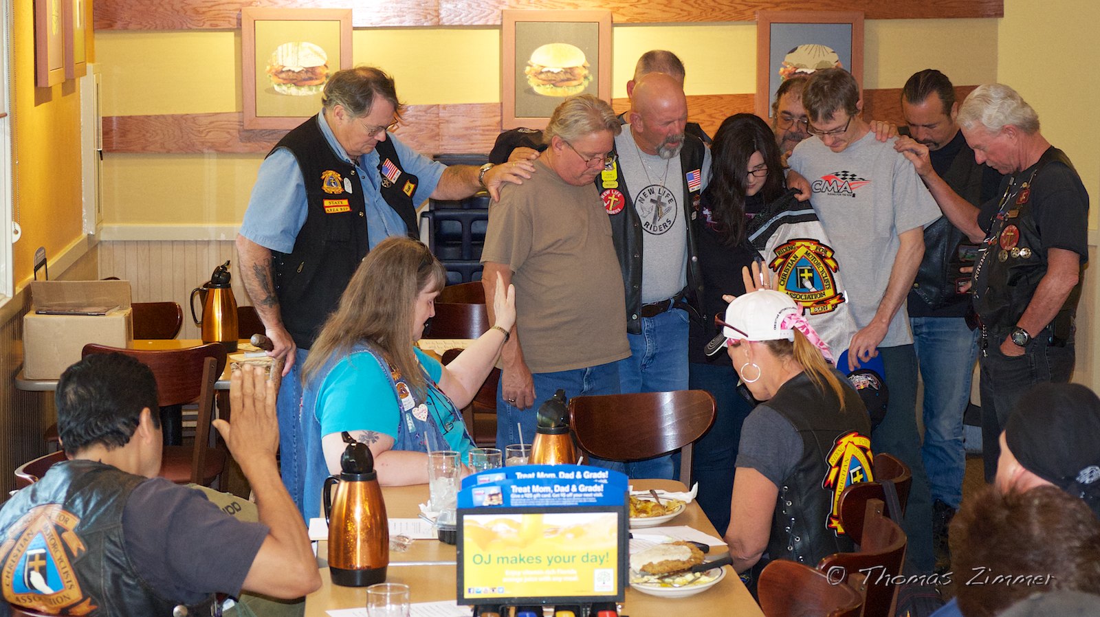 We had out New Life Riders chapter meeting this evening at our usual location, the IHOP nearIH183 and Duval. We had a really good meeting. Don presented CMA colors to four new members (three shown, one couldn’t be there), and then we prayed over them. We also has a few visitors, and our Area Reps Randy and Paula were in attendance as well. Tim our server did a great job as always, the food was all top notch. We had the usual agenda, and I announced the availability of “Moments”, the book I just published. I even got to sign some. After the meeting we went out to kick tires and fellowship around the bikes. All went well, until someone discovered they had a low tire, then all the trouble shooters came out the woodwork and pumped it up and inspected it for punctures. Didn’t find any, but hopefully he got home ok. Well, thats all for now, enjoy the pics,