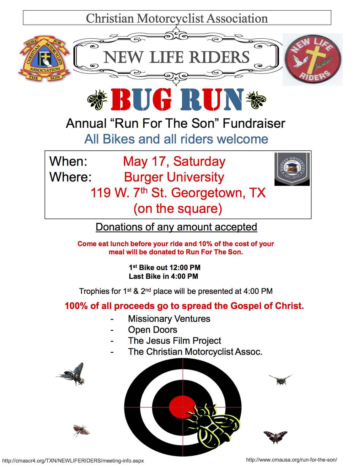 Tonight was the night when all the clubs meet to build the calendar of events for the coming year. As I describe it, it sounds like a big deal, but actually it’s pretty simple. Our UCOA officers Swirv and Chief sit at a table with the calendar for the year and we (the various clubs) wander over to let them know our desired date, event name and info. For New Life Riders, we wanted to turn in our 3rd annual Bug Run for May 17th, which will be held at Burger University again. The Bug Run benefits the Christian Motorcyclists annual Run For The Son Fundraiser, and 100% of the proceeds go toward spreading the Gospel. Here are a few pictures, and a picture of the flyer. I will post it again as we get closer to May.