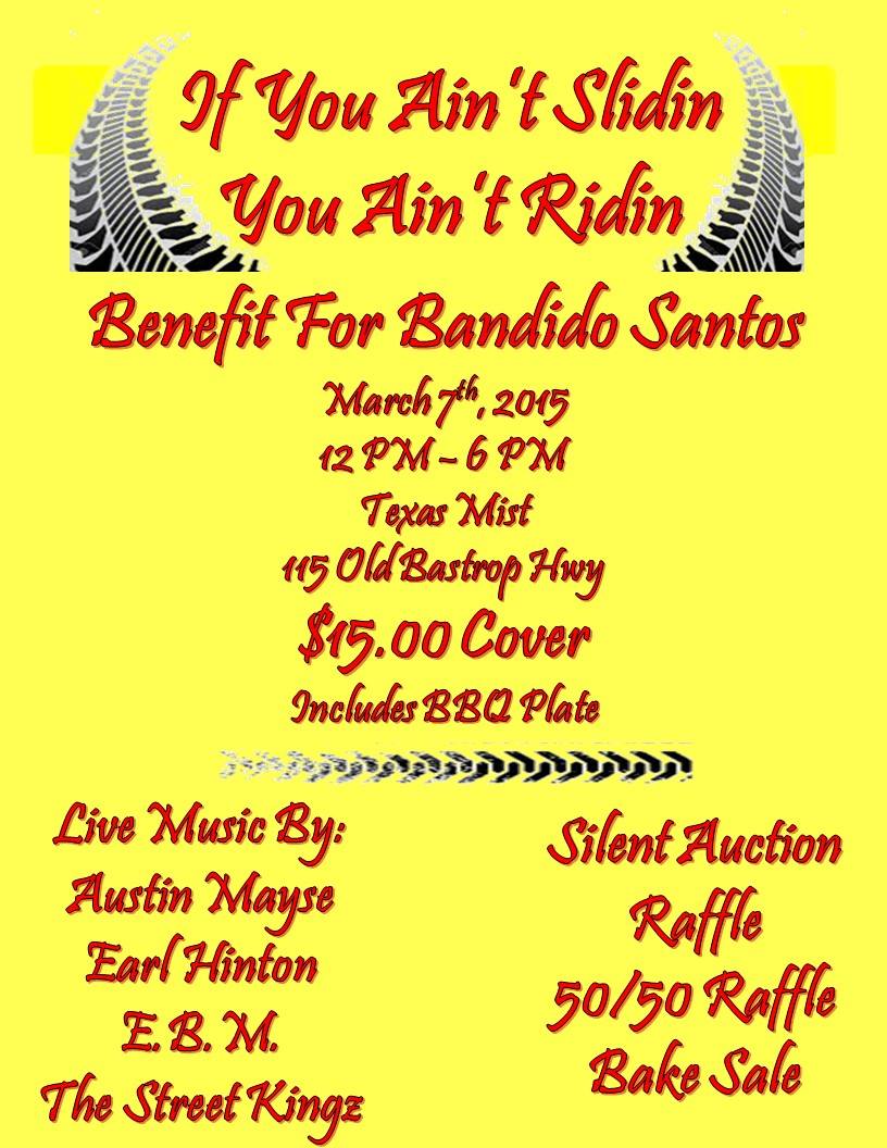 Note: I also wanted to remind everyone that the benefit for Bandido Santos is tomorrow March 7th at Texas Mist. The festivities start at noon. There is a $15 cover charge, and all monies raised go to help our friend get through this “painful” (and I mean that literally) experience. I hope to see y’all there. Flyer below.