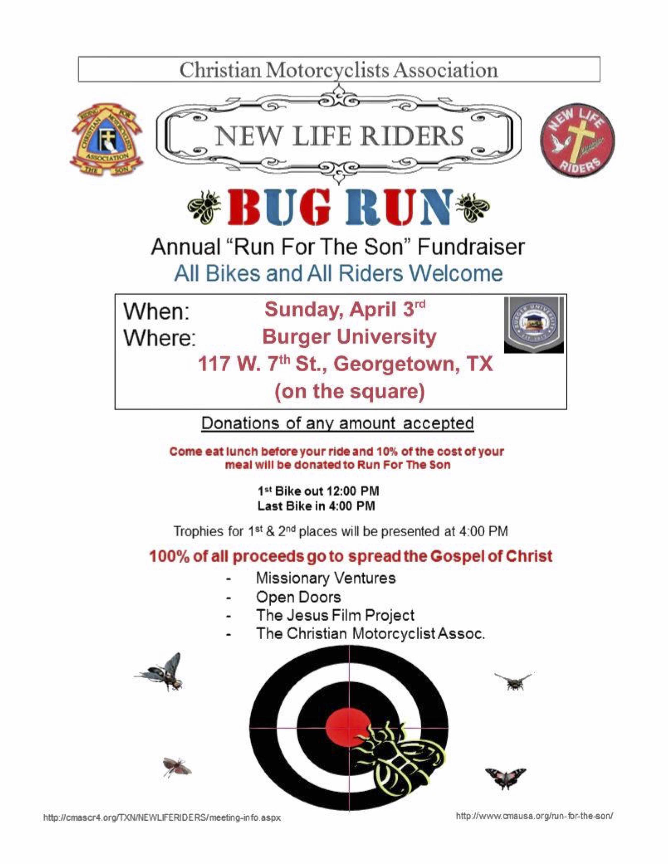 Our New Life Riders Bug Run is this Sunday at Burger University in Georgetown. First bike out is noon. Come on out for some great burgers, a great ride and a chance to win a great trophy.