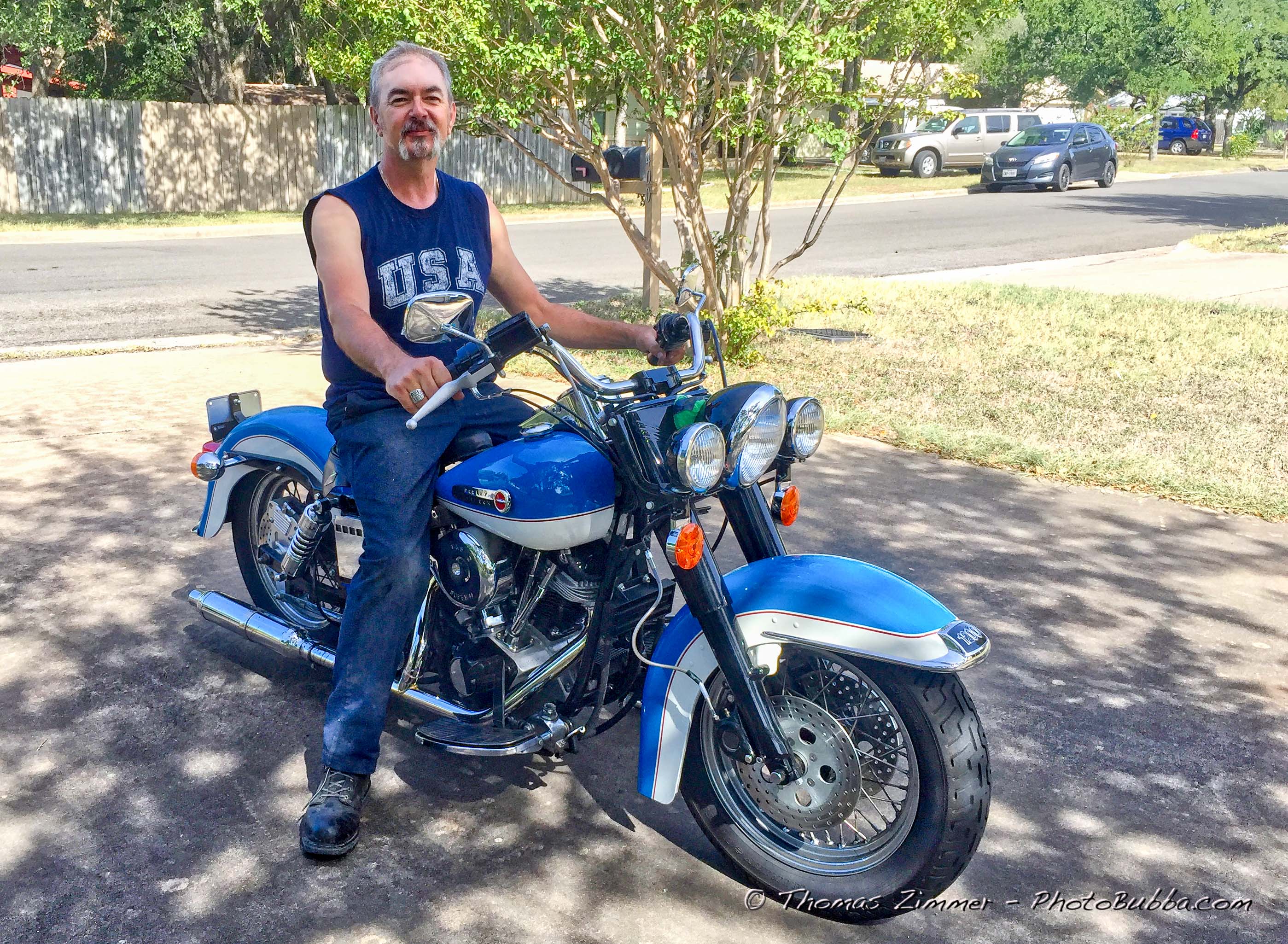 Well, Debbie headed to Cali to visit relatives, so naturally I took her ’74 Shovelhead out for a ride. I had visions of going to Hog Alley up in Georgetown, but as I rode her, my aim dropped a bit (my darn left hand keeps going to sleep), and I headed over to Marty’s house (near the Roadhouse) to show Miracle to him. Marty is a paint and body man, in addition to being a biker and a member of the local BACA (Bikers Against Child Abuse) chapter. Anyway, Marty created the paint for Miracle, and he did a wonderful job. So, since we hadn’t been to his house to show him the completed work, I thought I would surprise him. I got within a couple of blocks and couldn’t remember where he lived, so I had to call to get the correct address, but soon enough I arrived in his driveway. He was very pleased with the result, and of course I had to take a photo of him sitting on Miracle. Here you go Marty, your new screen saver 🙂