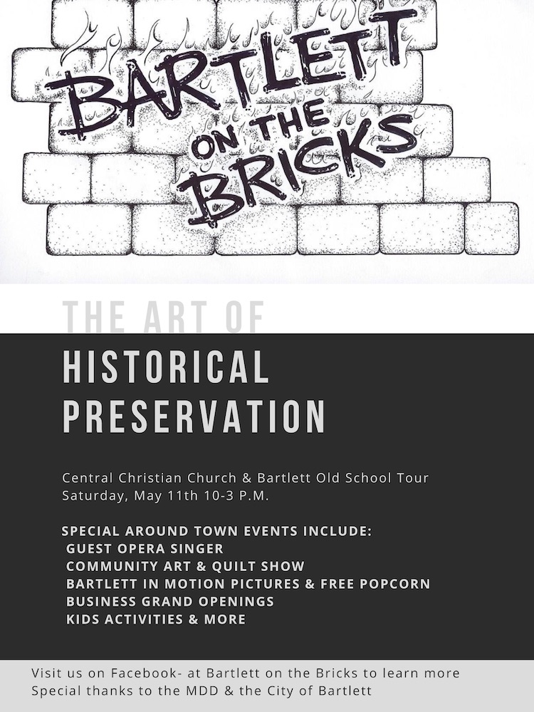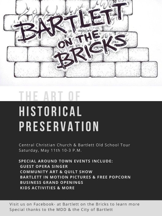 I wanted to let all my friends know that the Bartlett On The Bricks city wide event coming next Saturday May 11th from 10 am to 3 pm. It is called Bartlett on the Bricks, and there will be a bunch of interesting and entertaining activities. The flyers are included below. Y’all come on out, going to be a great time!