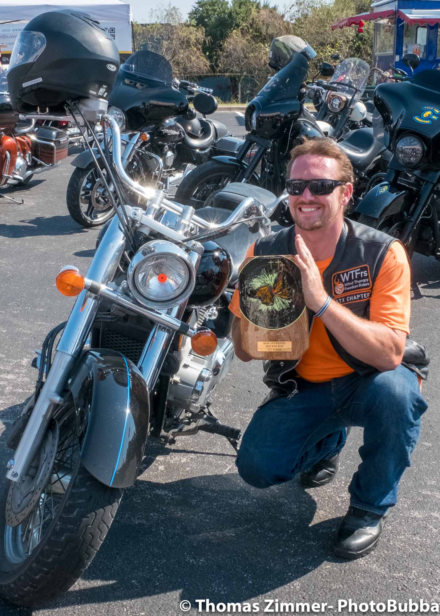 This year the Bug Run went off without a hitch. Our chapter planned big, so we were able to provide burgers, hot dogs, chips soda or water and cookies to everyone that came to our booth. And, we did have a lot of people visit and we appreciated all the donations they brought. I think we raised between $500 and $1000 this year, due in no small part to the generous donations from several of the local motorcycle clubs. All donations of any size are appreciated of course. The weather was spectacular, starting off cool and only pushing into the 90s in the afternoon. It was a truly beautiful day. We had the President of the local Companeros MC come by and though he said he wouldn’t be able to actually participate in the run today, he thought they deserved a special mention because of a “run in” they had with a large swarm of I believe it was butterflies. I agreed, and we have a photo below to prove it. The winners this year were part of a group new to me called the Wind Therapy Freedom Riders, or WTFrs for short. I am thinking that might be a play on words, but I’m not saying anything. Ok, so without any further delay, here are the photos, and I hope you enjoy them.