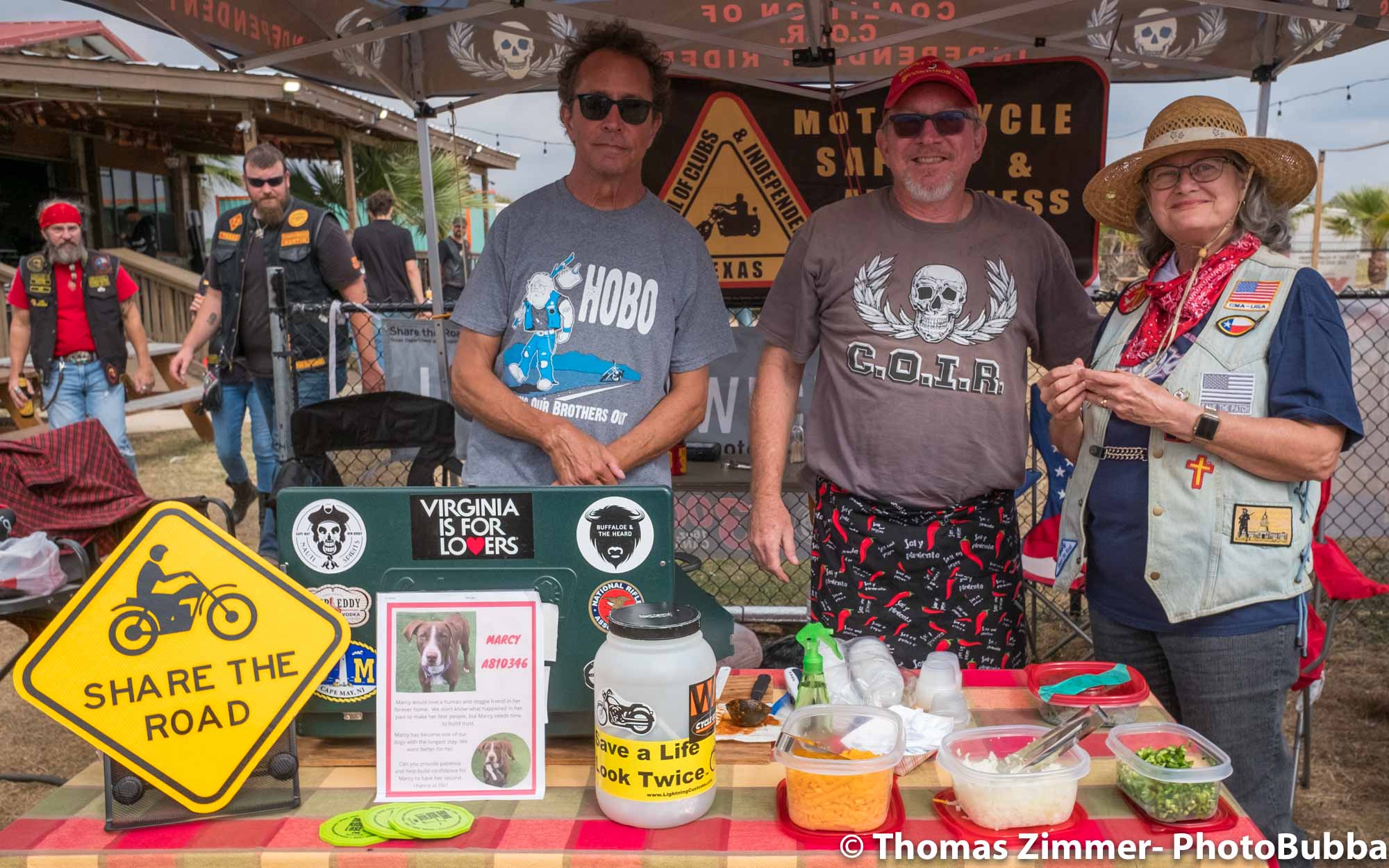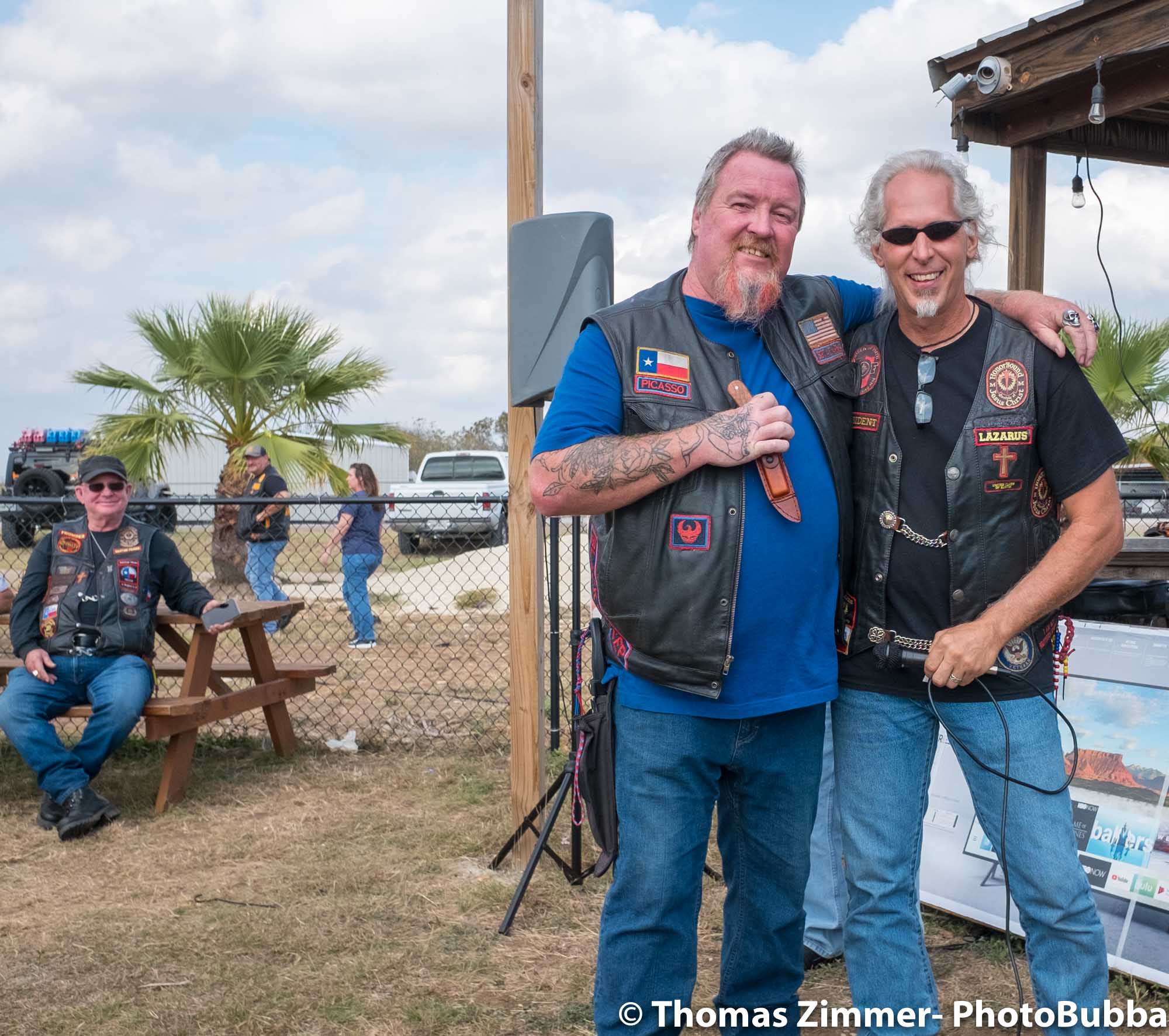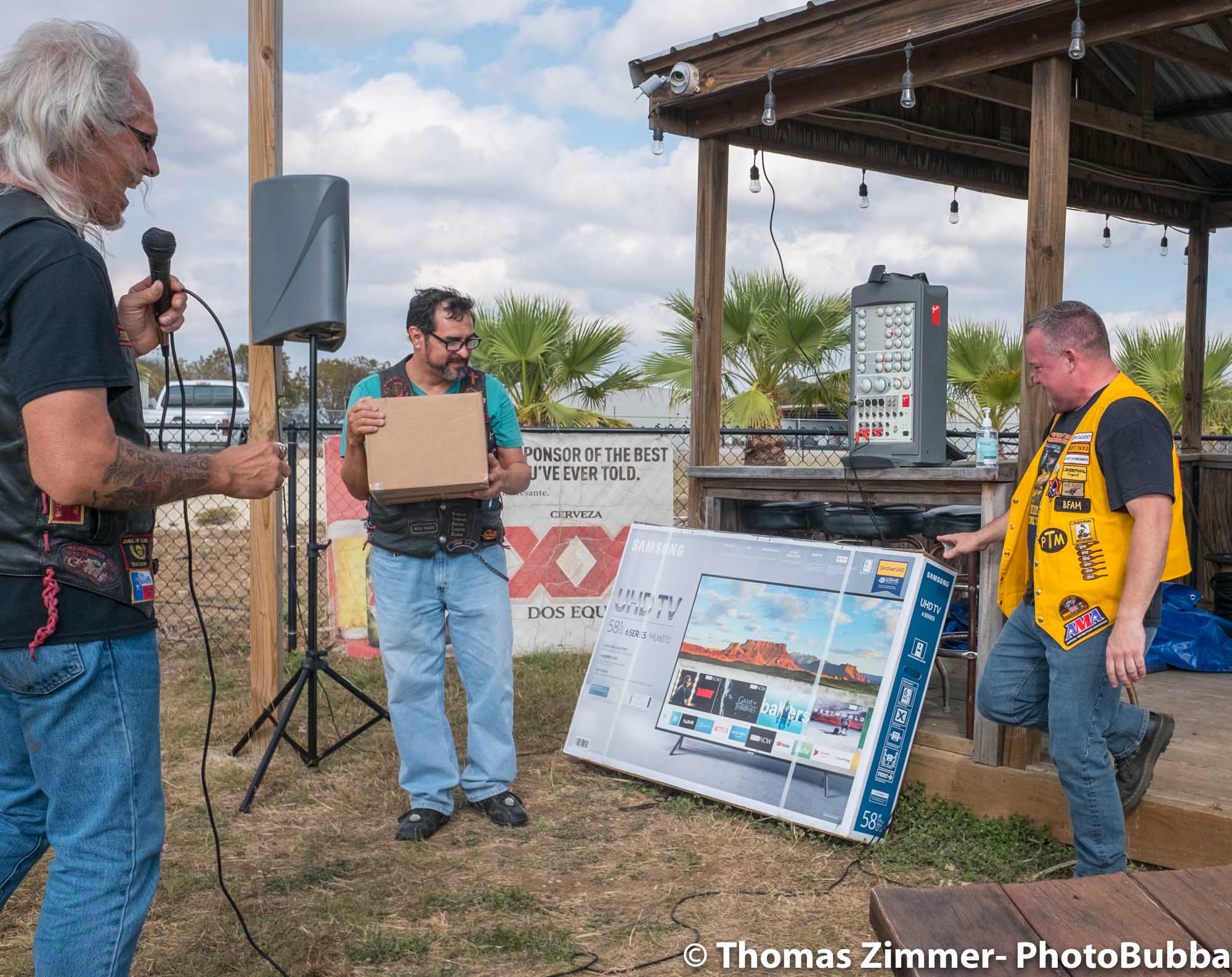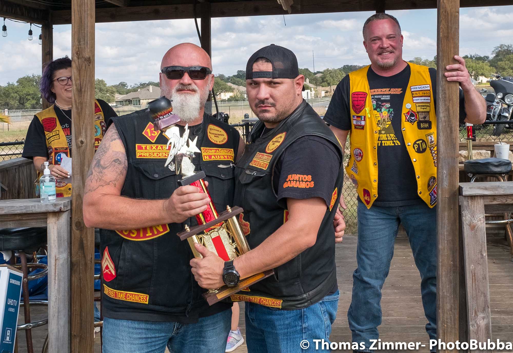 We had the annual COC&I chili cook-off today out at Time Out Sports Bar in Liberty Hill. It was an outdoor event, and was well attended. Everyone brought masks of course, but with the wonderful weather and brisk breeze, there were few health concerns. I did see a fair number of people wearing masks. Everyone attending this free event was given the opportunity to try over 20 chili styles, so it was quite a competition. I usually asked for a small portion in a tasting cup, but at least one crew handed me a full bowl of chili. Fortunately it was very good, so i chowed down and finished it easily. I did of course share with Debbie, at least most of the time. One of our newer chapter members (Kevin) joined us and got to meet lots of our friends and taste as many of the chilis as he could. After the tasting finished, we had the COC&I meeting, and heard from our legislative warriors about up-coming bills, and about the January 25th legislative day where we all go down to the capital to talk with your legislators. Apparently there are going to be a lot of changes from two years ago when we had the last one of these, but I’m sure it will be an interesting day to say the least. At the end of the meeting, the trophies were handed out for the chili-cook-off winners. The photos are in reverse winner order, third, second, first, and then peoples choice, so you can look at the photos to see who won. Then we had the raffle give-aways, finishing with drawing of the HOBO (Help Our Brothers Out) 100th anniversary Harley Davidson Road King winner. Turns out he was at the event, but went home. When we called him, he came right back and I was able to get his photo with the bike. Another wonderful event for the motorcycle riding community.