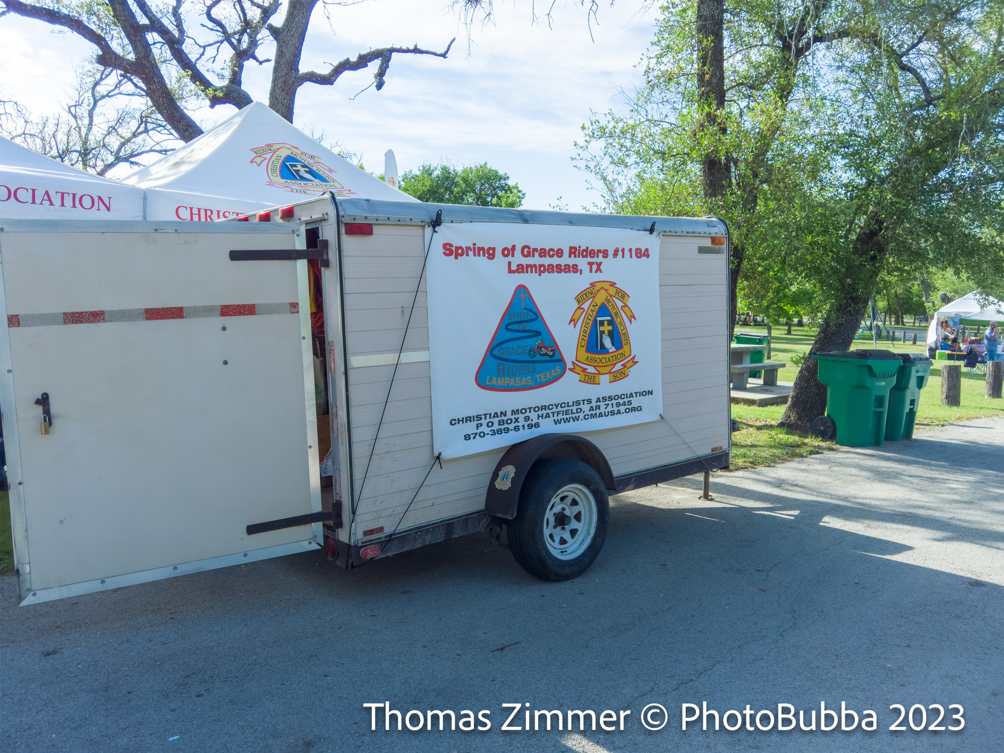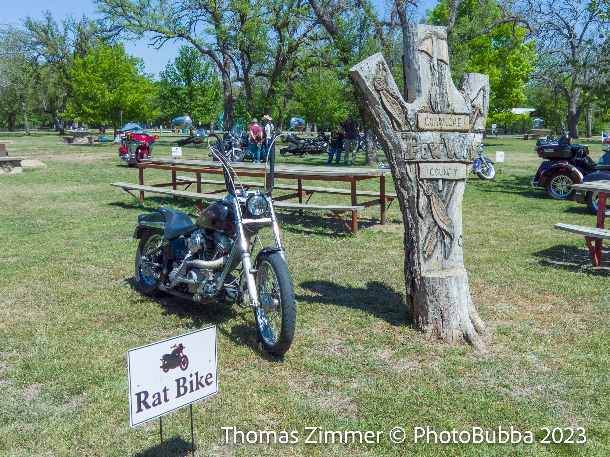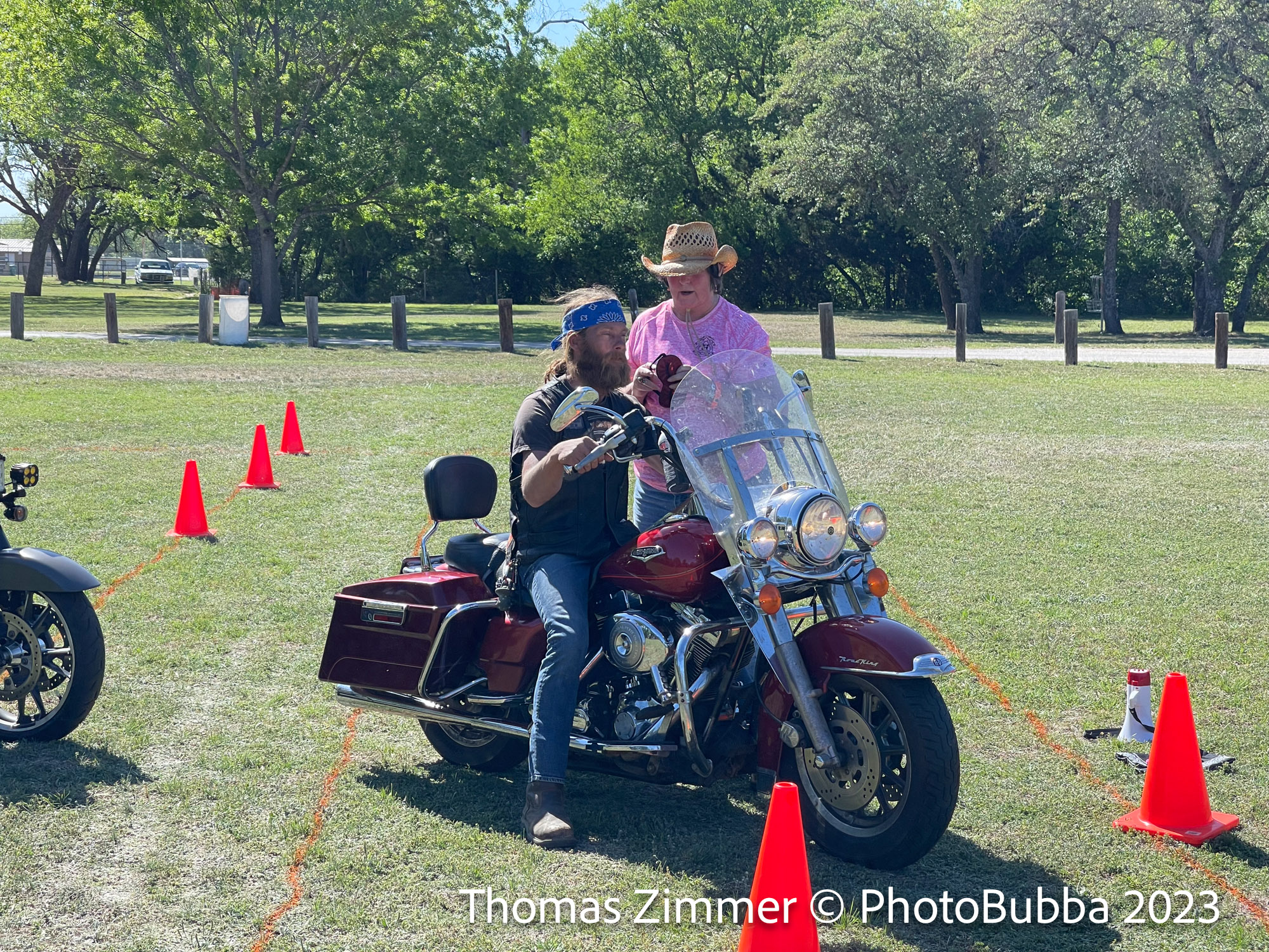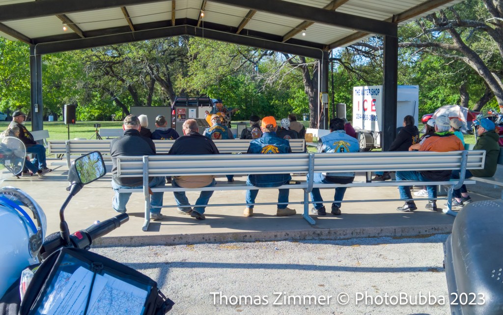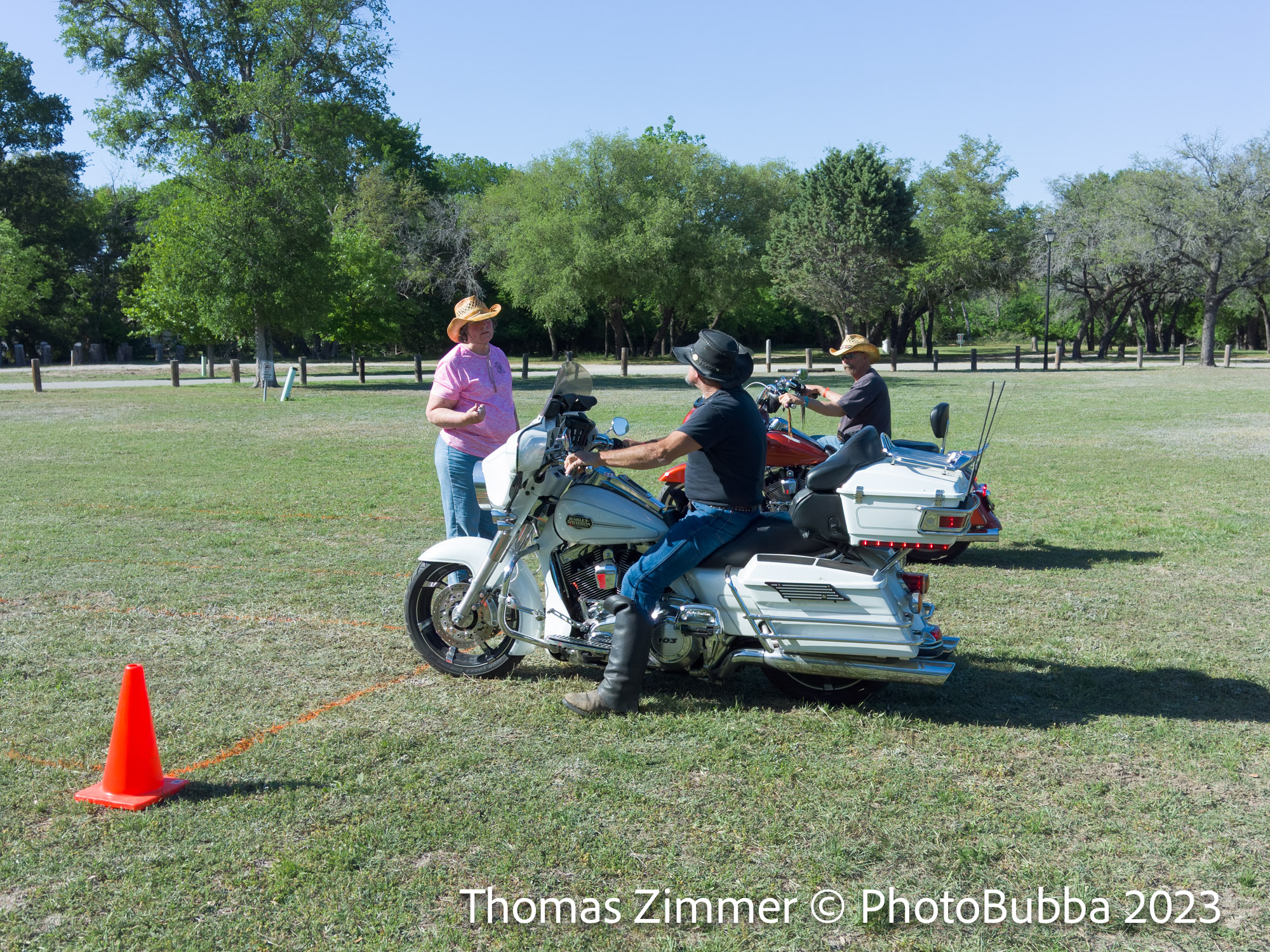 We headed out Friday afternoon for Comanche Texas to attend the 50 year anniversary rally for TMRA (Texas Motorcycle Roadriders Association). It was a bit warm Friday afternoon, but Saturday and Sunday were wonderful. Our fearless leader Jean Hudgins has passed away a few months ago, so I think everyone was still in a bit of a shock, but rally attendance was good, and we had a great time. The rally included the usual components, like the silent auction, the Hobo Stew (no hobos were harmed in the making of this stew), the Bike show, Saturday morning hill country ride, Saturday afternoon bike games, including one bike spill. Fortunately no-one was injured, and the lucky (lucky?) fellow won first price in the blindfolded bike ride because he crashed right on top of the target cone Amazing!. We also had some great tunes Saturday evening after the awards ceremony, and got to talk with old friends and go to dinner of course. Sunday Don Potter held a short memorial for Jean, followed by a great sermon and music. I got lots of pictures, including one of the bike spill, but unfortunately no video of that part. I did get video of the Bike Parade, the Memorial, and the service Sunday morning which are posted below, followed by the photos.