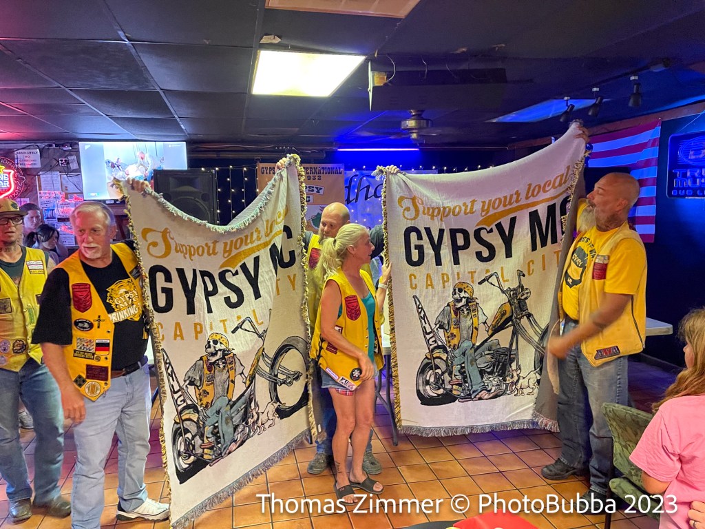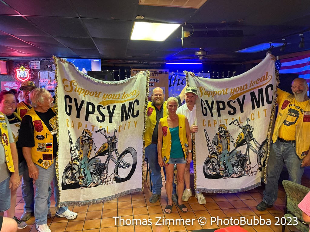 We dropped in on the Gypsy MC Anniversary party Saturday at the Roadhouse. We arrived a bit later than most, but we were in time for the drawing for raffle items. In particular we won a set of 12 ounce insulated Harley Davidson cups in a box set that were donated by CTHD (Central Texas Harley Davidson). Debbie also bought a ticket the one of the grand prizes, which was a very nice electric water squirt gun. It might sound kind of cheesy, but I can tell you that was one very nice water powered weapon. Unfortunately she didn’t win it, so now I just have to decide if I’m going to buy her one! Anyway, everybody seemed to have a good time. At the end they awarded a couple of very special Gypsy blankets to some very special people. Just a few photos today.